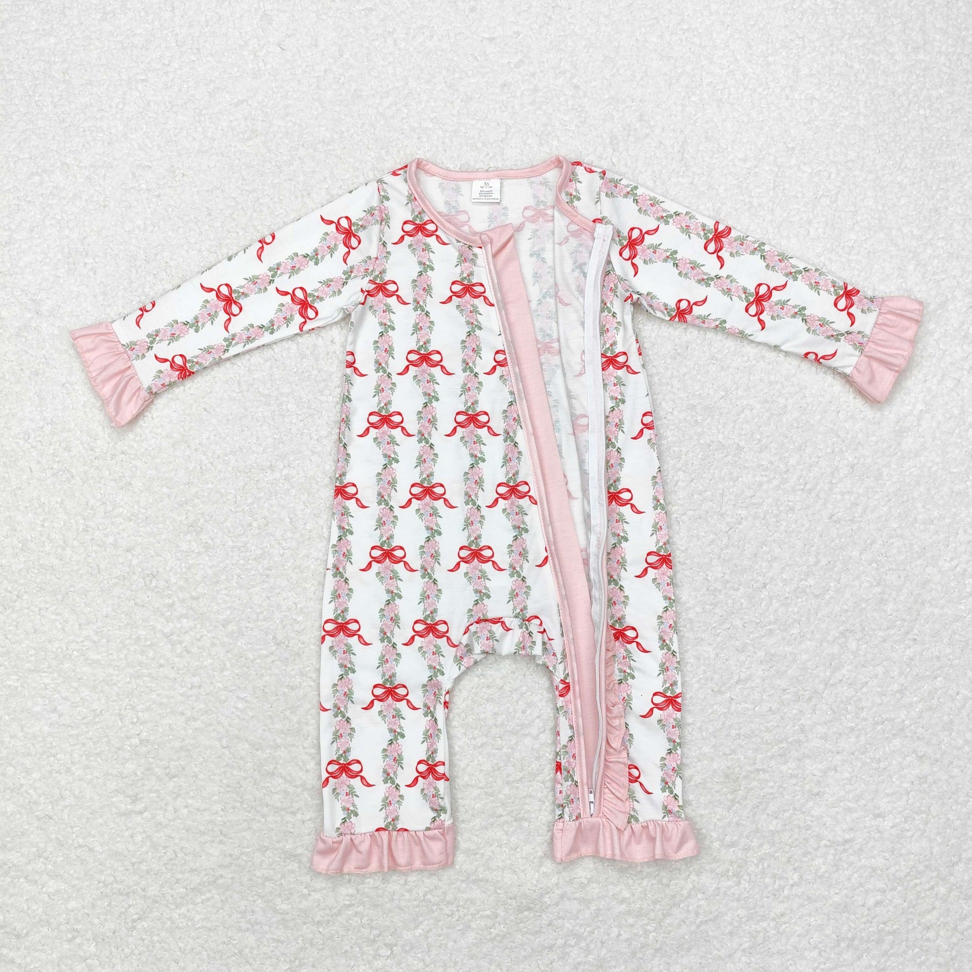 LR1517 Modal flower leaf bow pattern Pink lace white zipper long-sleeved onesie