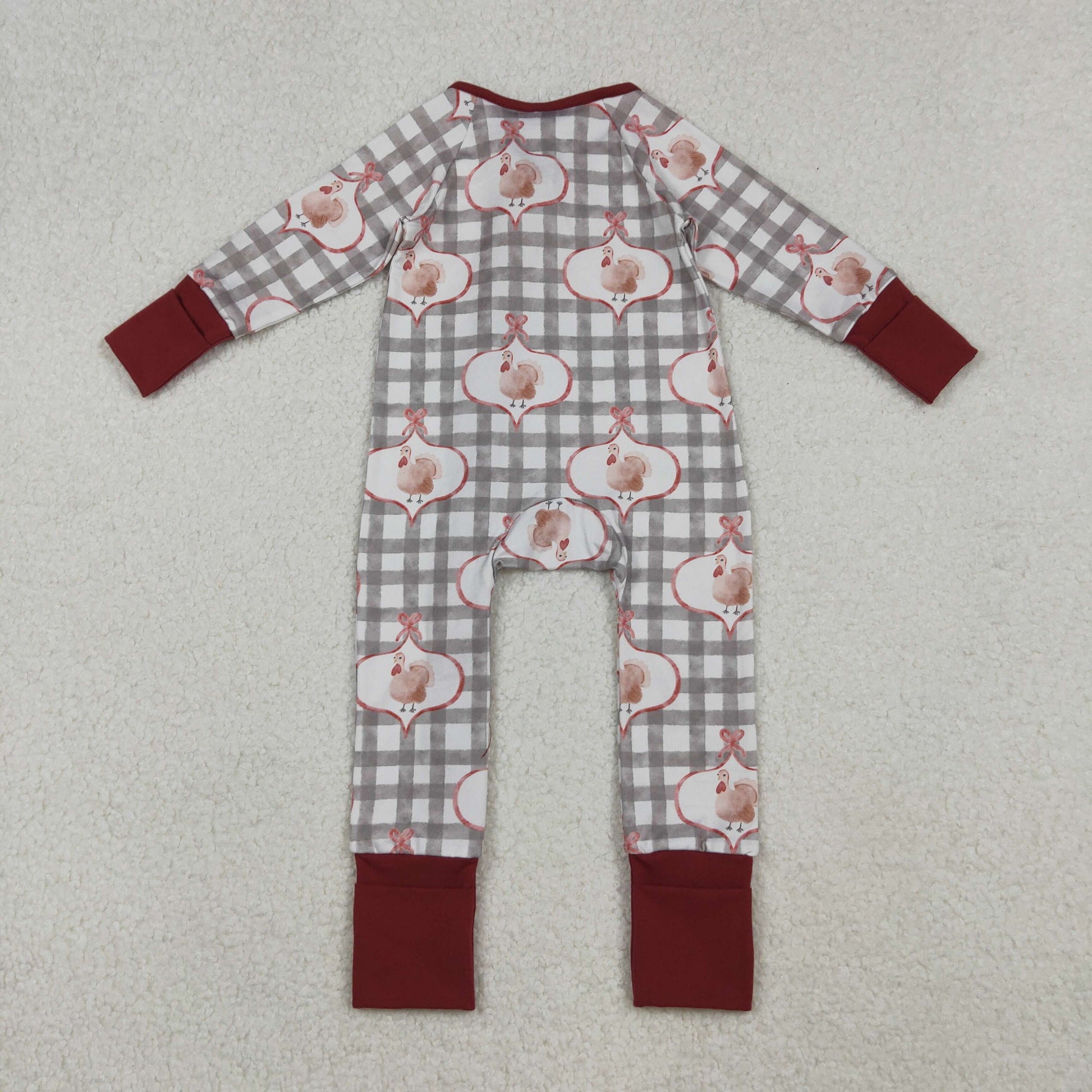 LR2691 Thanksgiving Turkey Plaid Zipper Long Sleeve Girls Romper 202510