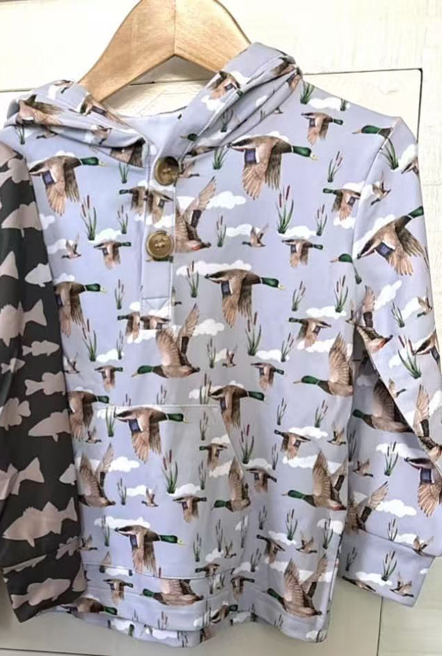 MOQ 5 PCS preorder BT1546 Duck Cloud Pattern Pocket Button Gray Hooded Long Sleeve Boys Top 202511