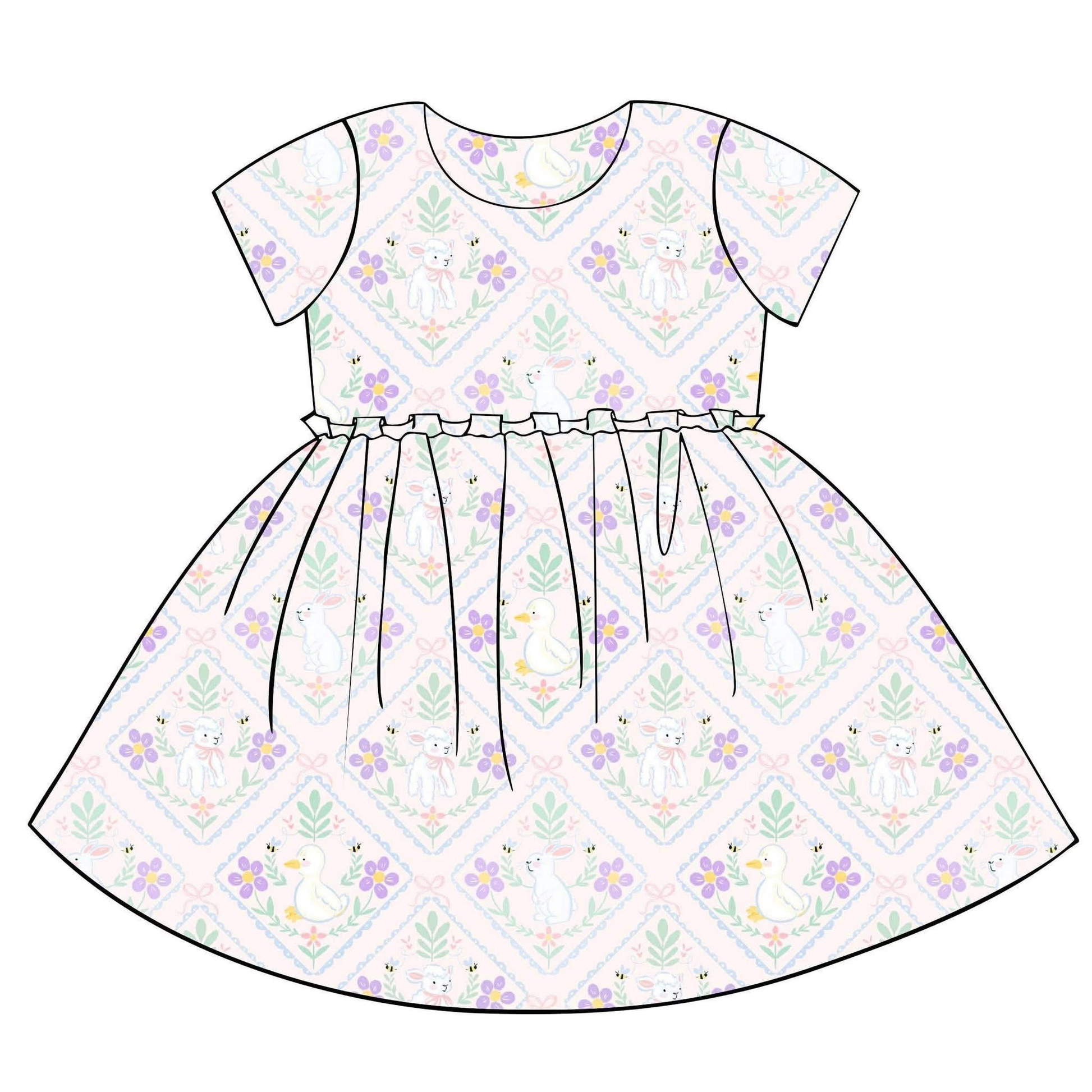 MOQ 5 PCS Preorder GSD3399 Easter Bunny Sheep Flower Leaf Pink Short Sleeve Dresses for Girls 202512