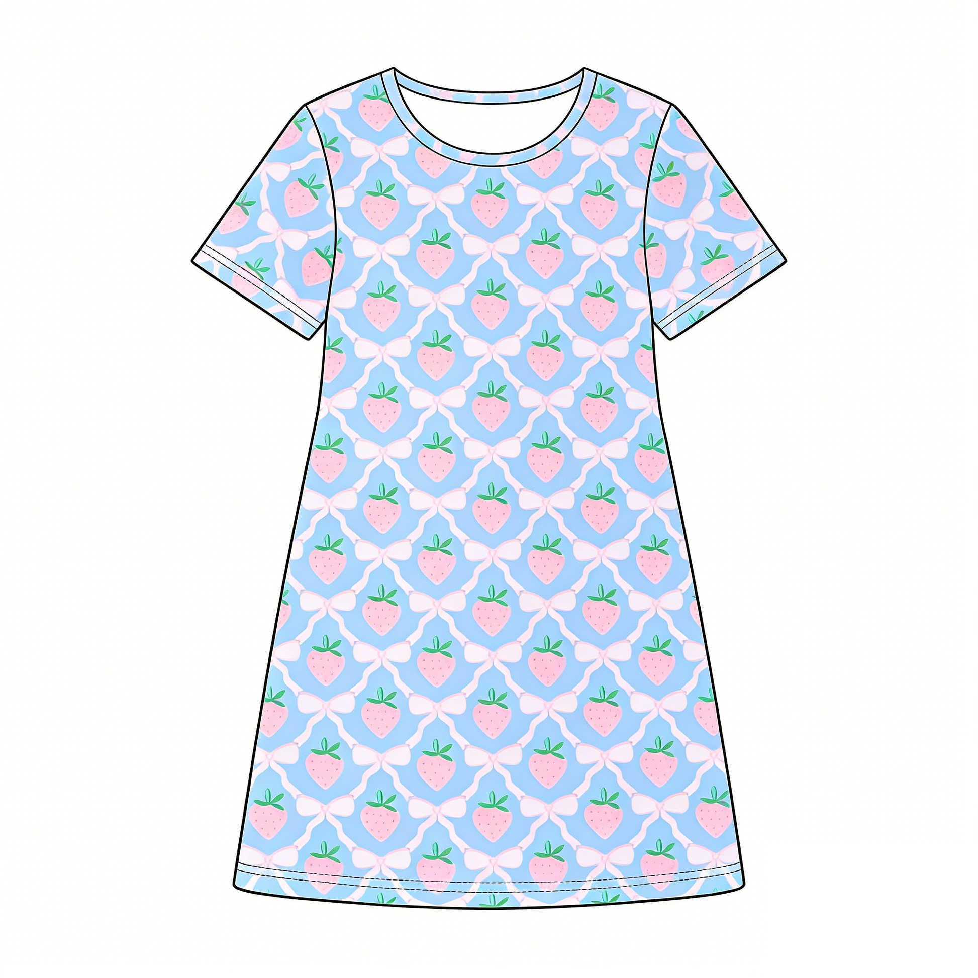 MOQ 5 PCS Preorder GSD3527 Strawberry Bows Blue Short Sleeve Dresses for Girls 202512