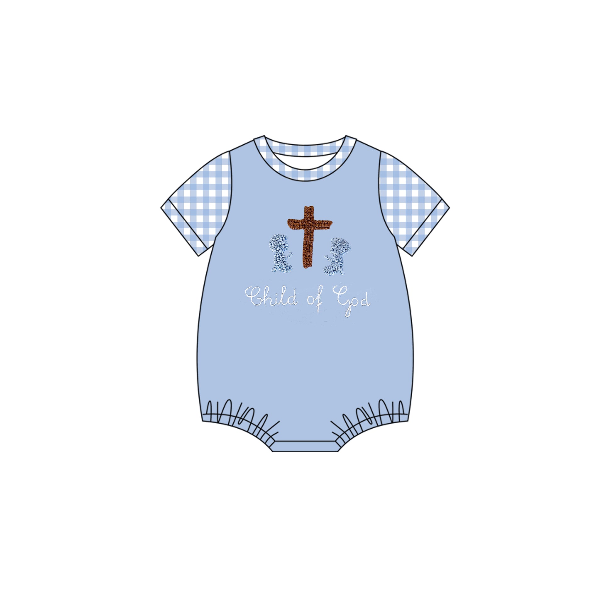 MOQ 5 PCS preorder SR3619 Easter Cross Blue Short Sleeve Boys Bubble Romper 202511