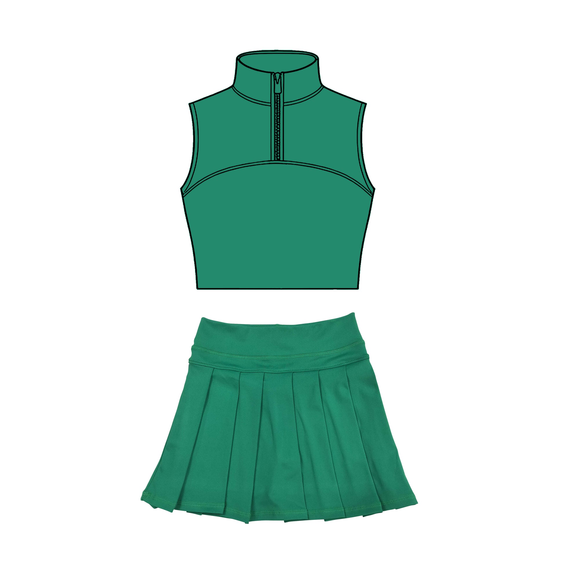 MOQ 5 preorder GSD3302 Solid Dark Green Zip Collar Sleeveless Pleated Skirts for Girls Yoga Sets 202511