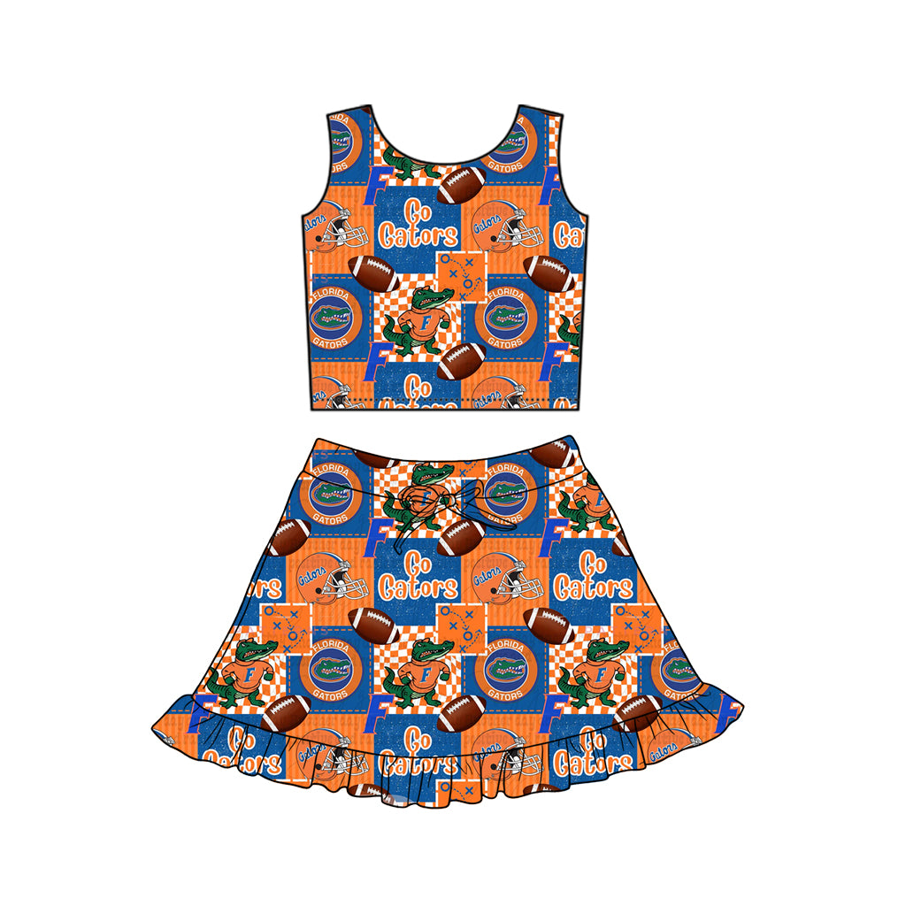 MOQ 5 preorder GSD3612 GO TEAM Crocodile Gators Plaid Blue Orange Sleeveless Top with Skirts for Girls Yoga Sets 202601