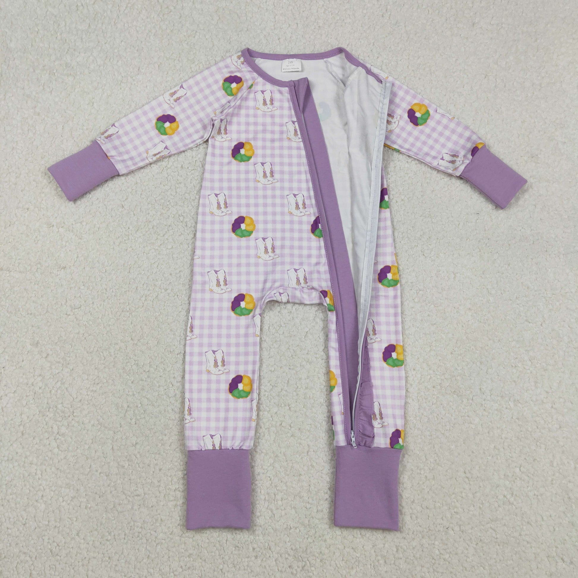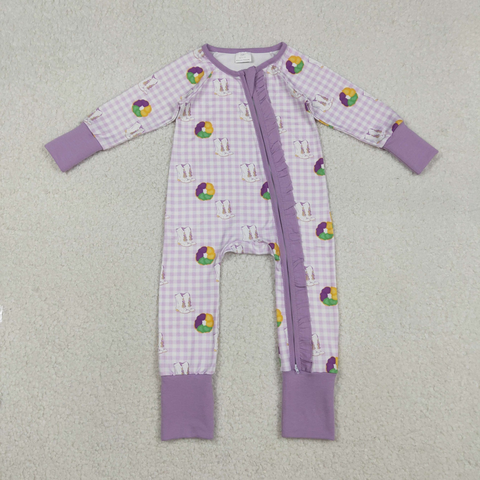 LR2783 Mardi Gras Purple Plaid Ruffle Zipper Long-Sleeved Girls Romper 202512 RTS