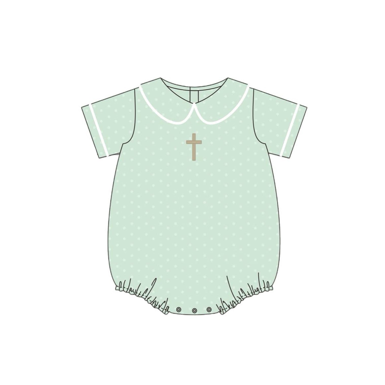 MOQ 8 Preorder SR3269 Easter Cross Doll Collar Pea Green Short Sleeve Boys Bubble Romper 202510 Sibling