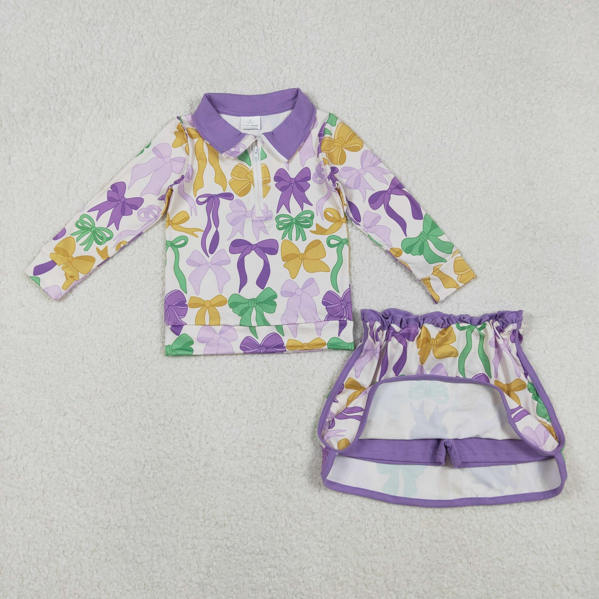 GLD1333 Bows Pattern Mardi Gras Purple Zipper Collar Long Sleeve Skirts Girls Sets 202511 RTS