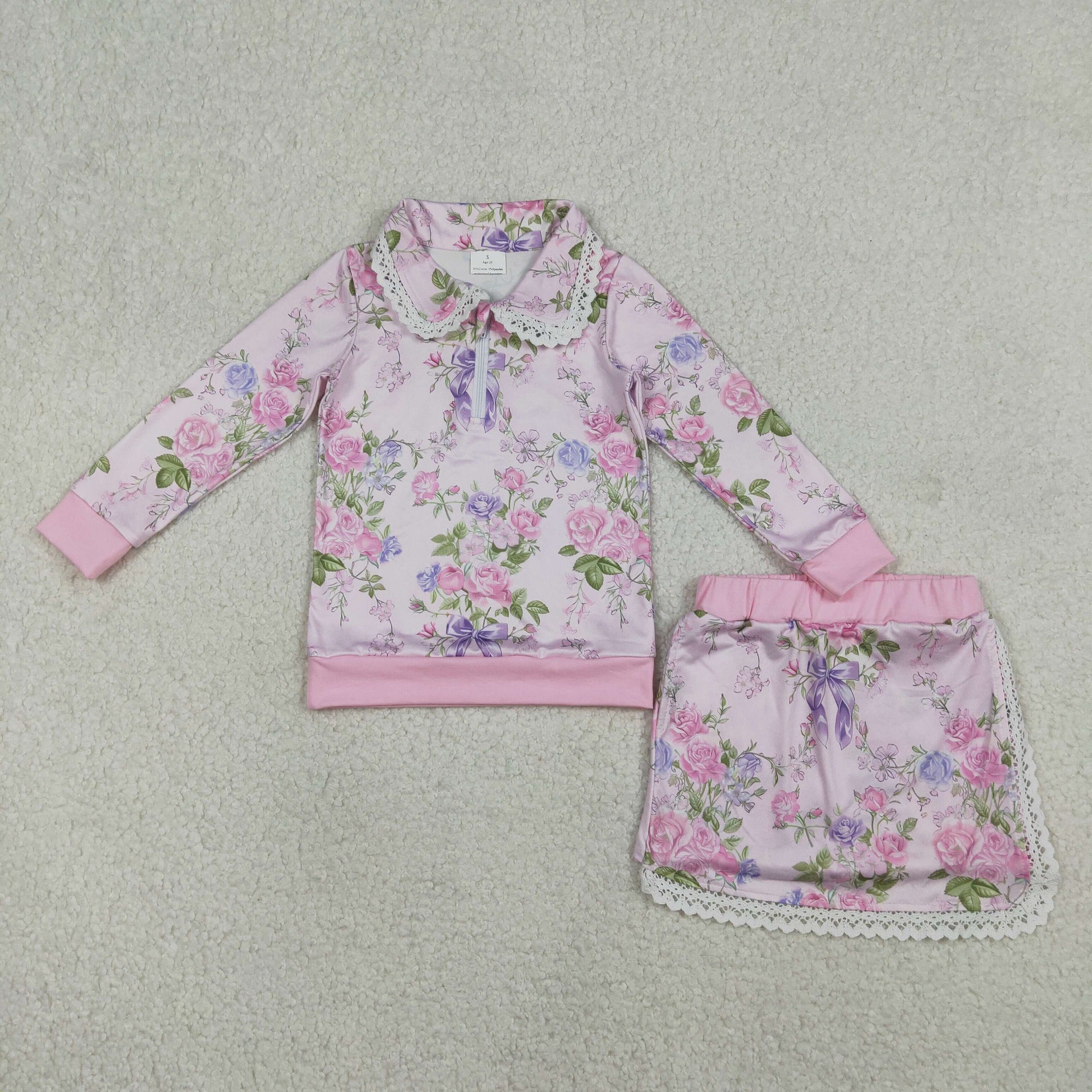 GLD1572 Flower Lace Ruffle Pink Zip Collar Long Sleeve Skirts Girls Sets 202601 RTS