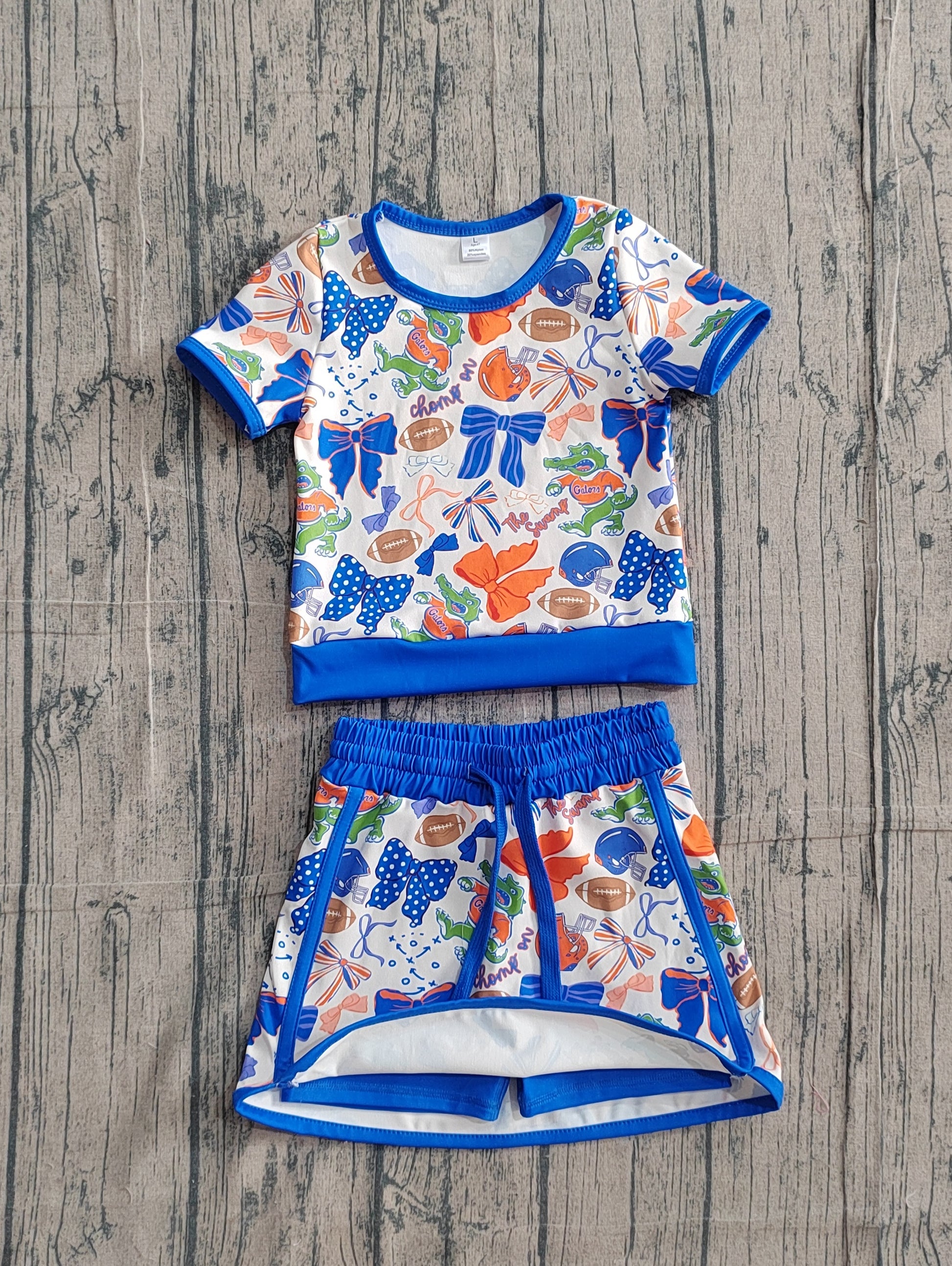 NO MOQ preorder GSD3698 GO TEAM Crocodile Football Orange Purple Bow Short Sleeve Top with Skirts for Girls Yoga Sets 202602