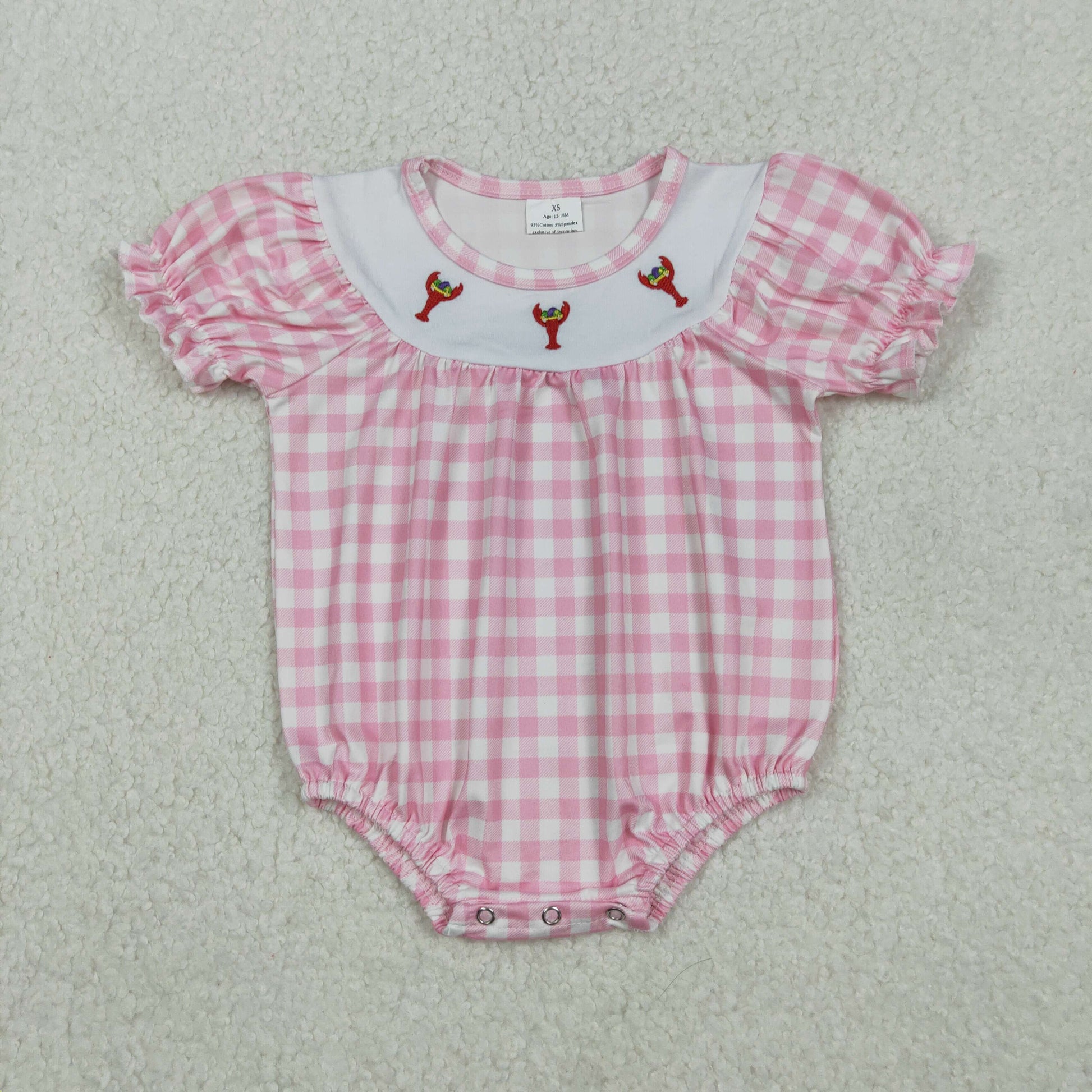 SR3256 Embroidered Mardi Gras Crayfish Pink Plaid Short-Sleeved Girls Bubble Romper 202511 RTS
