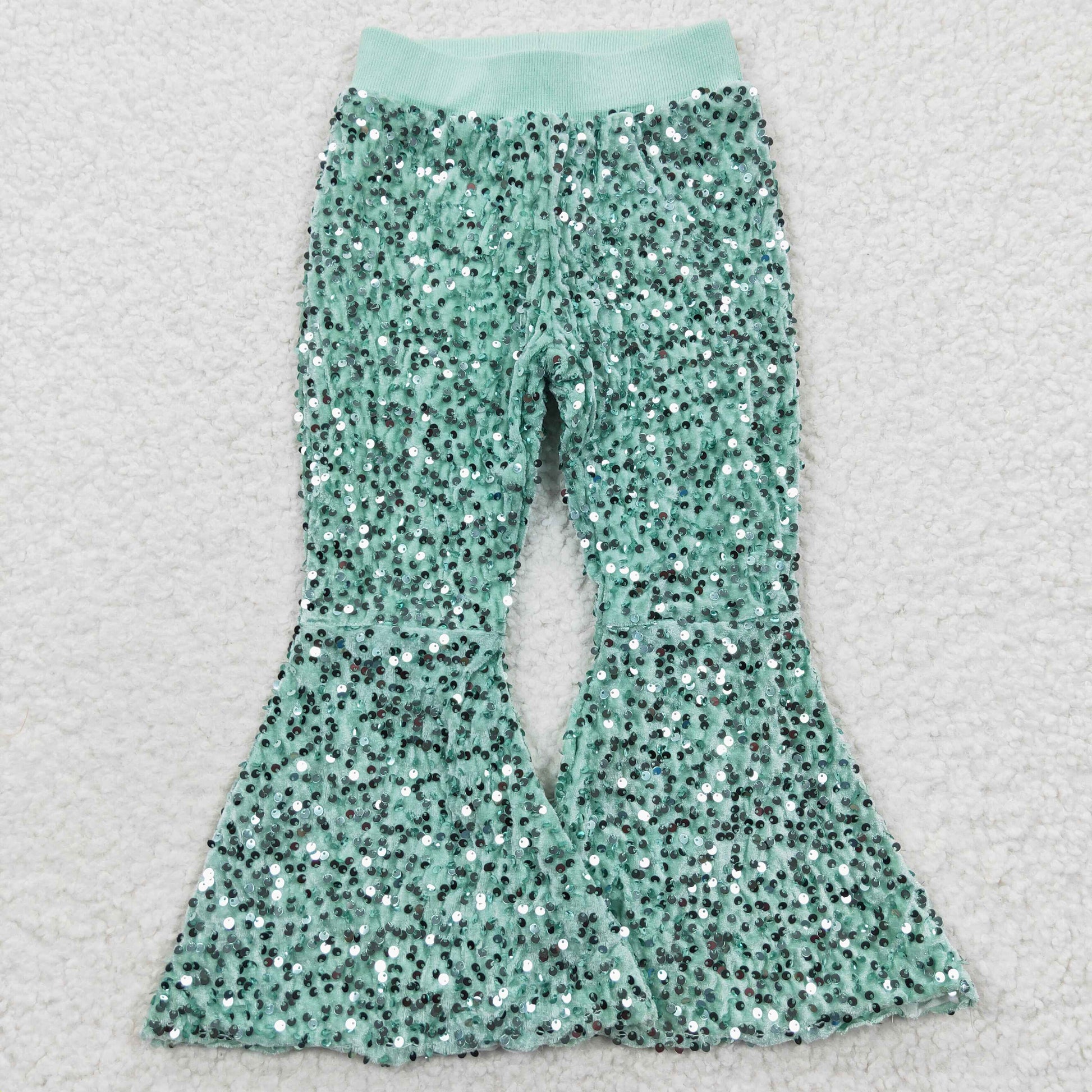 P0109 Green Sequin Bell-bottom Kids Long Pants