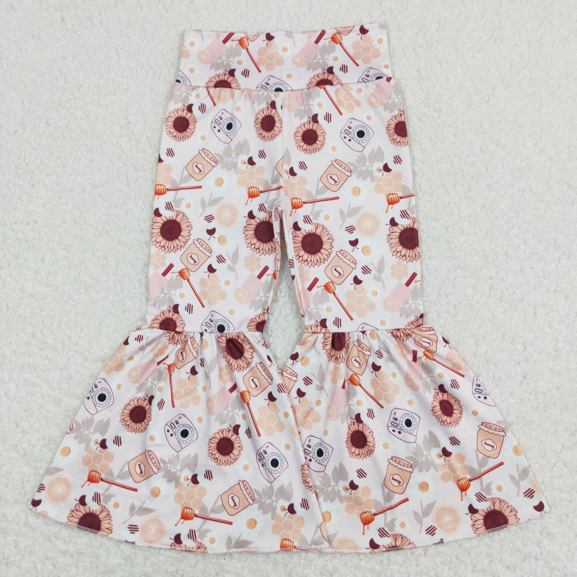 P0262 Sunflower Flower Camera Beige Girls Long Pants Bell Bottoms RTS 202508