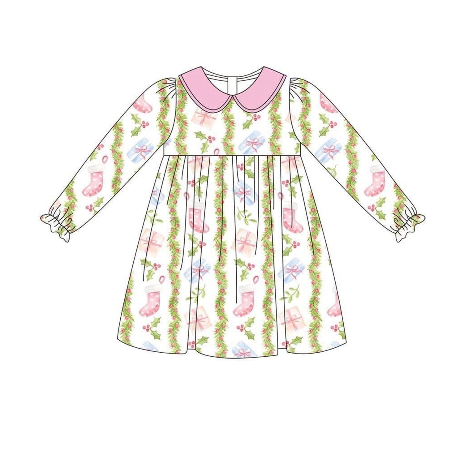 Preorder GLD1133 Christmas Gift Socks Leaves Pink Doll Collar Long Sleeve Dress Girls Boutique 202506