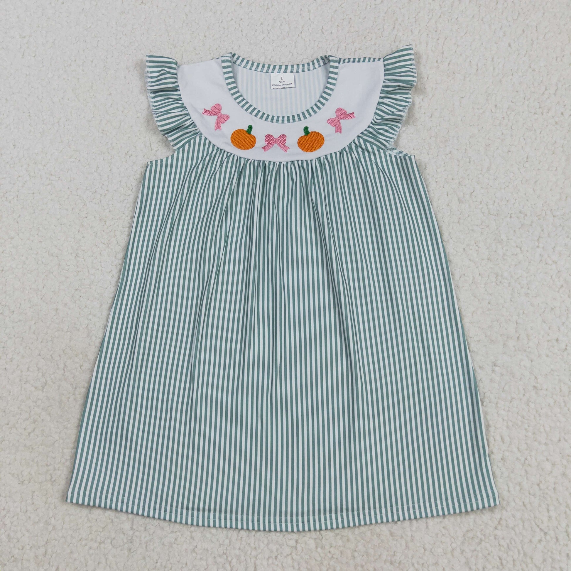 GSD2746 Girls Boutique Embroidered Pumpkin Bows Green Striped Fly Sleeve Dress 202508 RTS