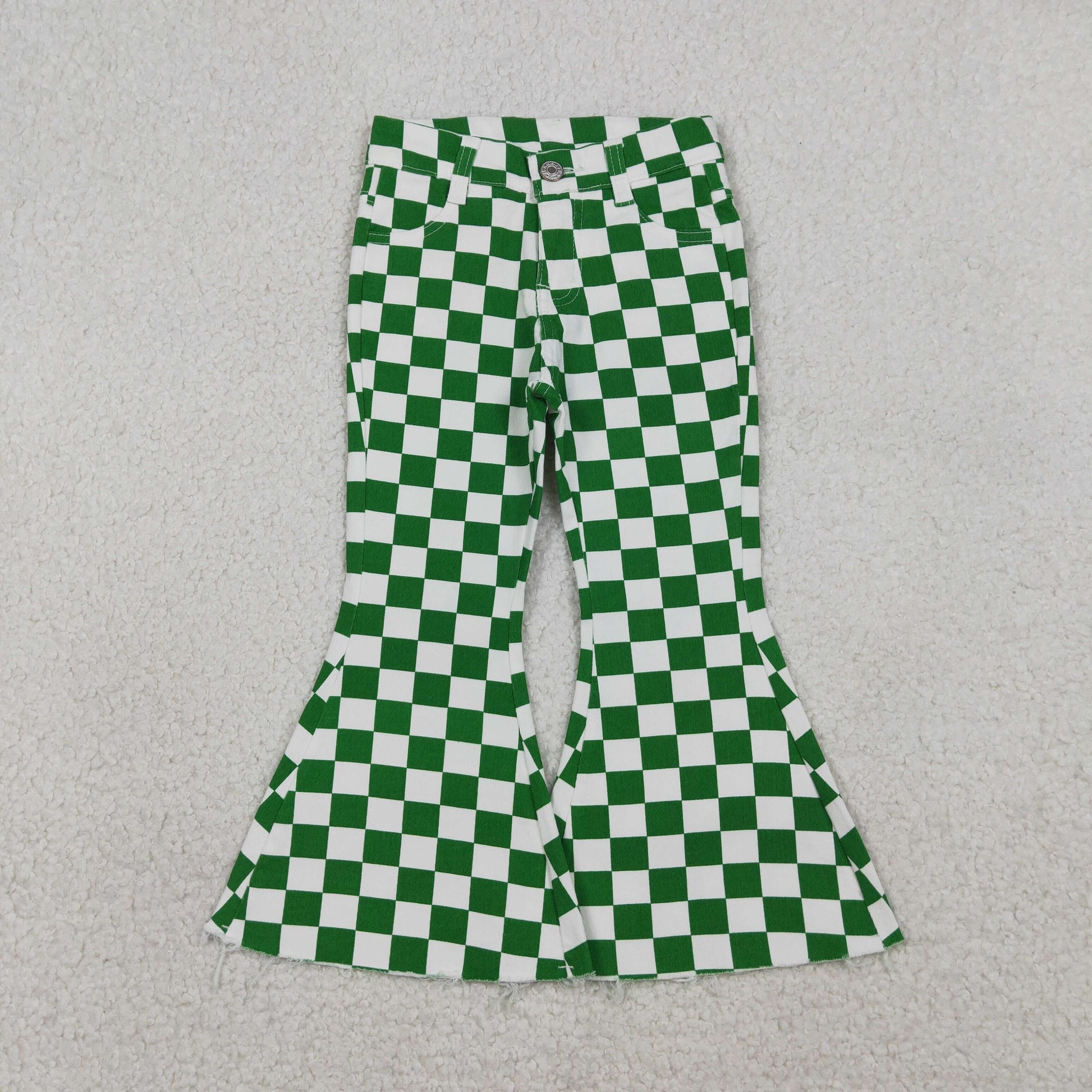 P0841 Girls Green White Plaid Denim Bell Bottom Pants Jeans 202601 RTS