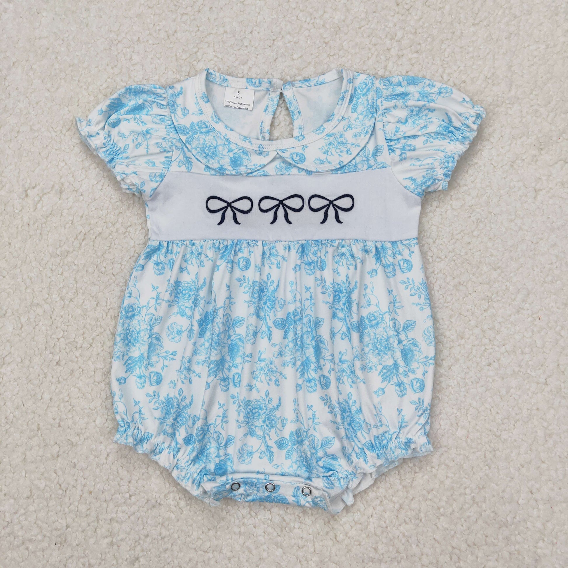 SR2784 Embroidered bows blue flower leaf short sleeve romper baby girl Boutique Summer clothes 202503 RTS