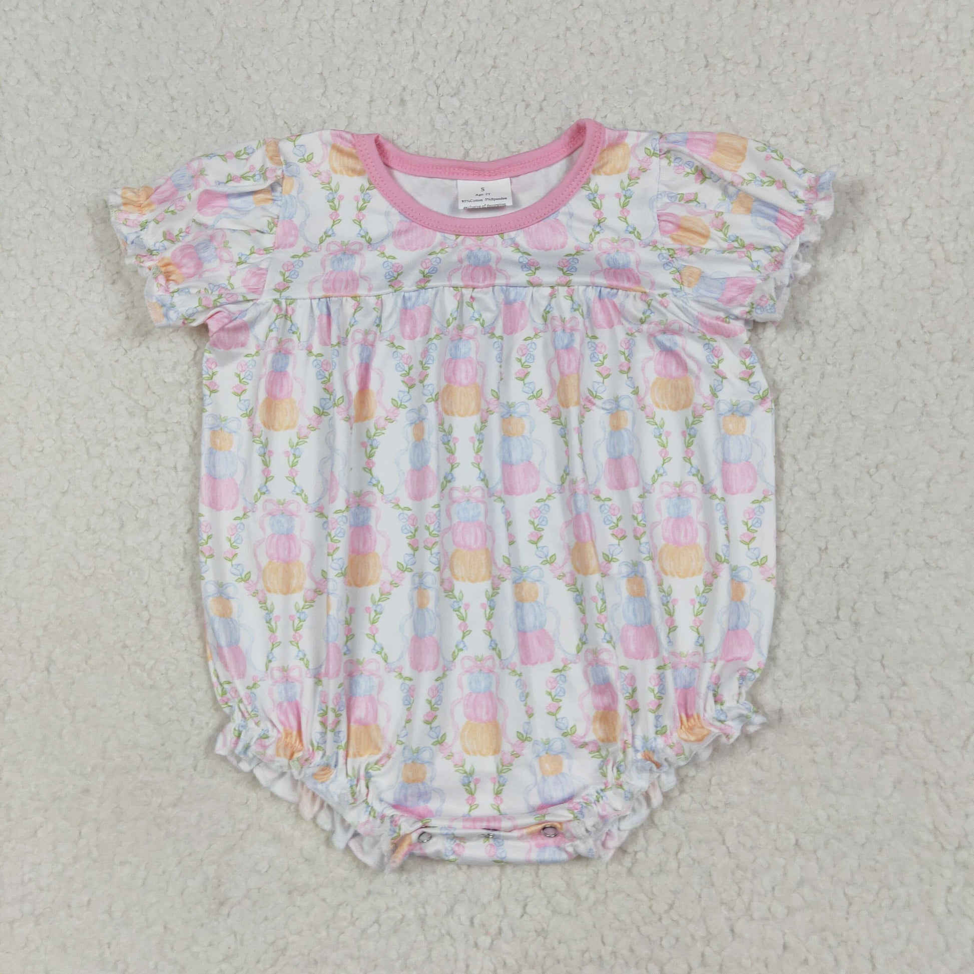 SR3151 Girls Boutique Bow Pattern Pumpkin Blossom Plaid Pink Short Sleeve Bubble Romper 202507 RTS