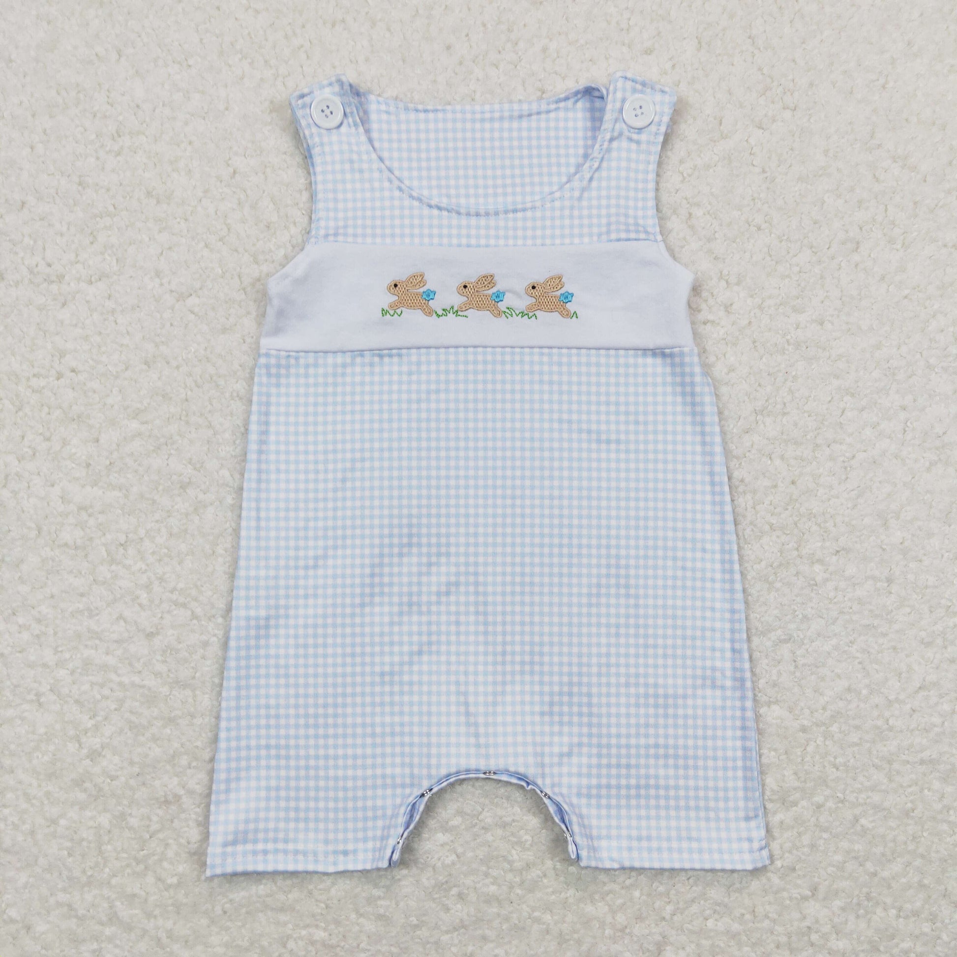 SR0621 Embroidered Three Rabbits Blue Plaid Sleeveless Boys Bubble Romper RTS 202508