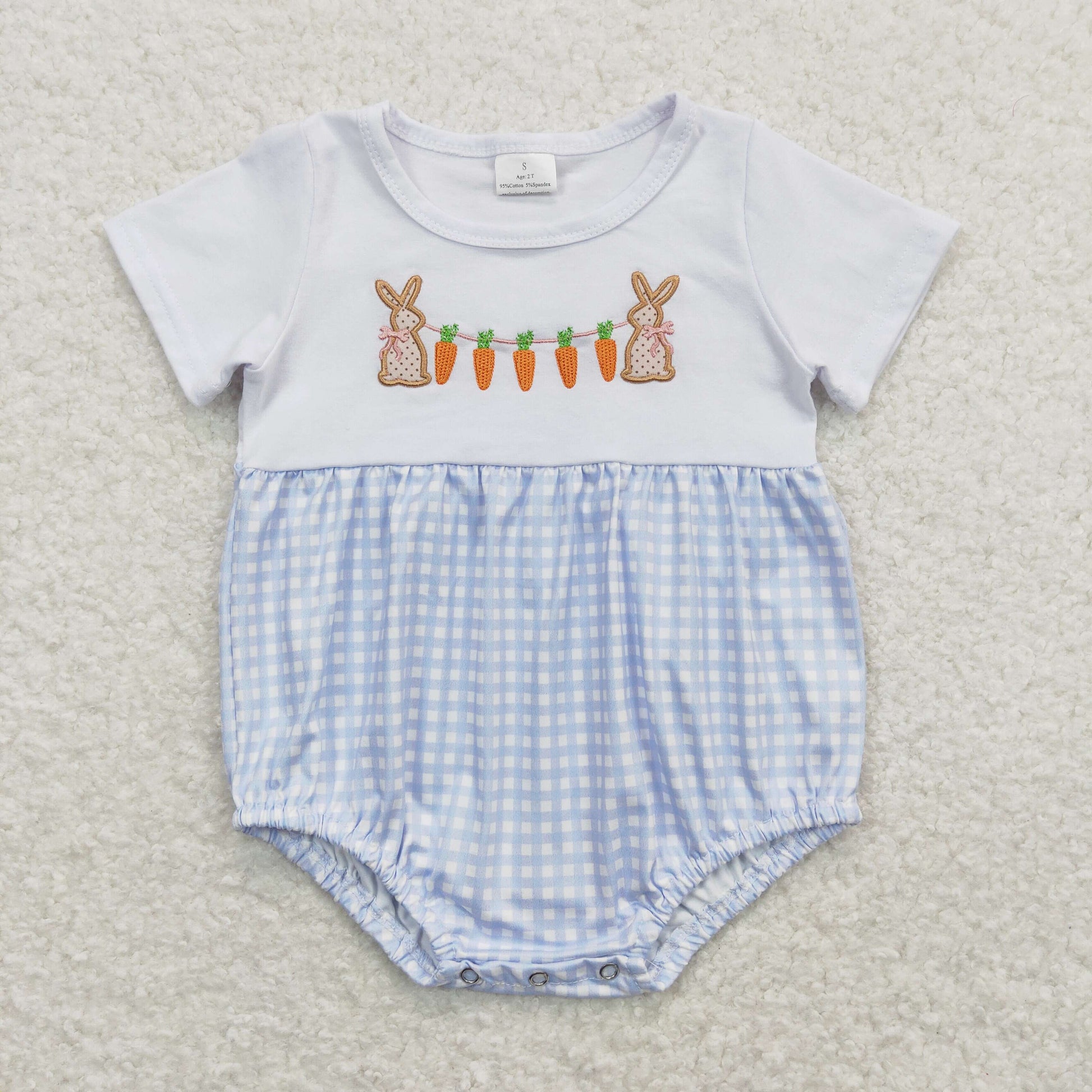 SR0723 Embroidered Easter Bunny Blue Plaid White Boys Short Sleeve Bubble Romper RTS 202508