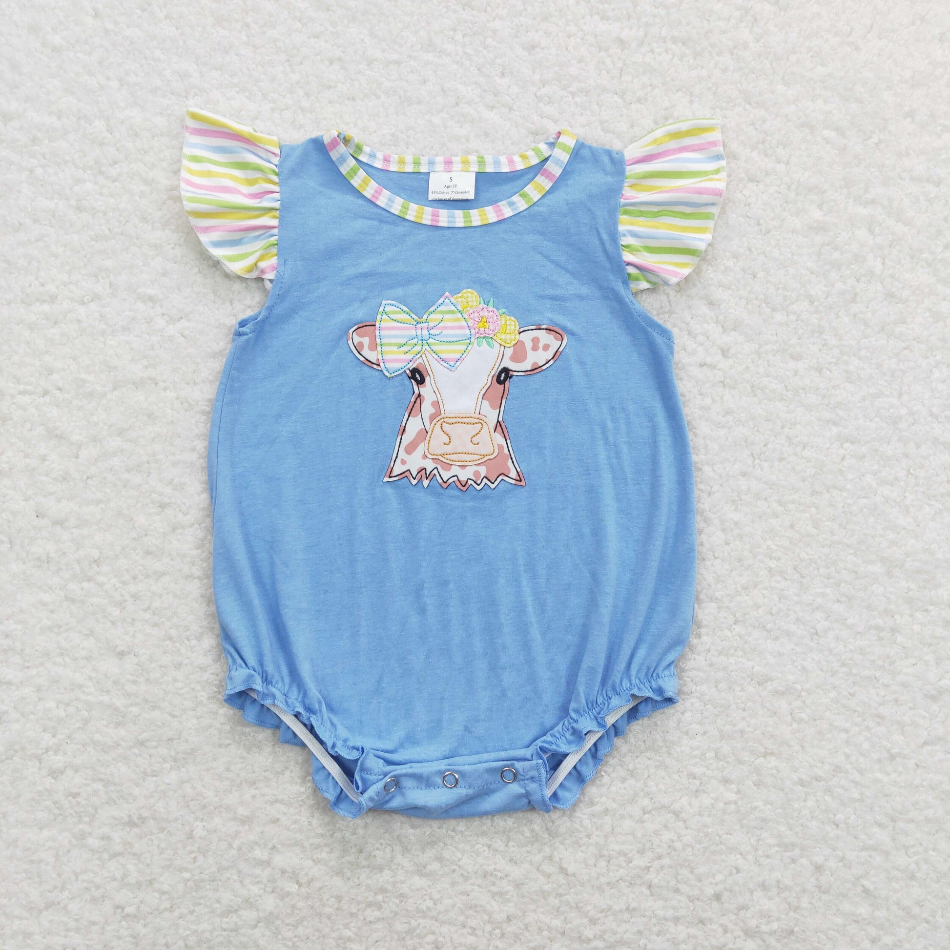 SR0825 Embroidered Bows Cow Colored Stripe Flying Sleeve Blue Romper Girls High Quality Clothing RTS 202507