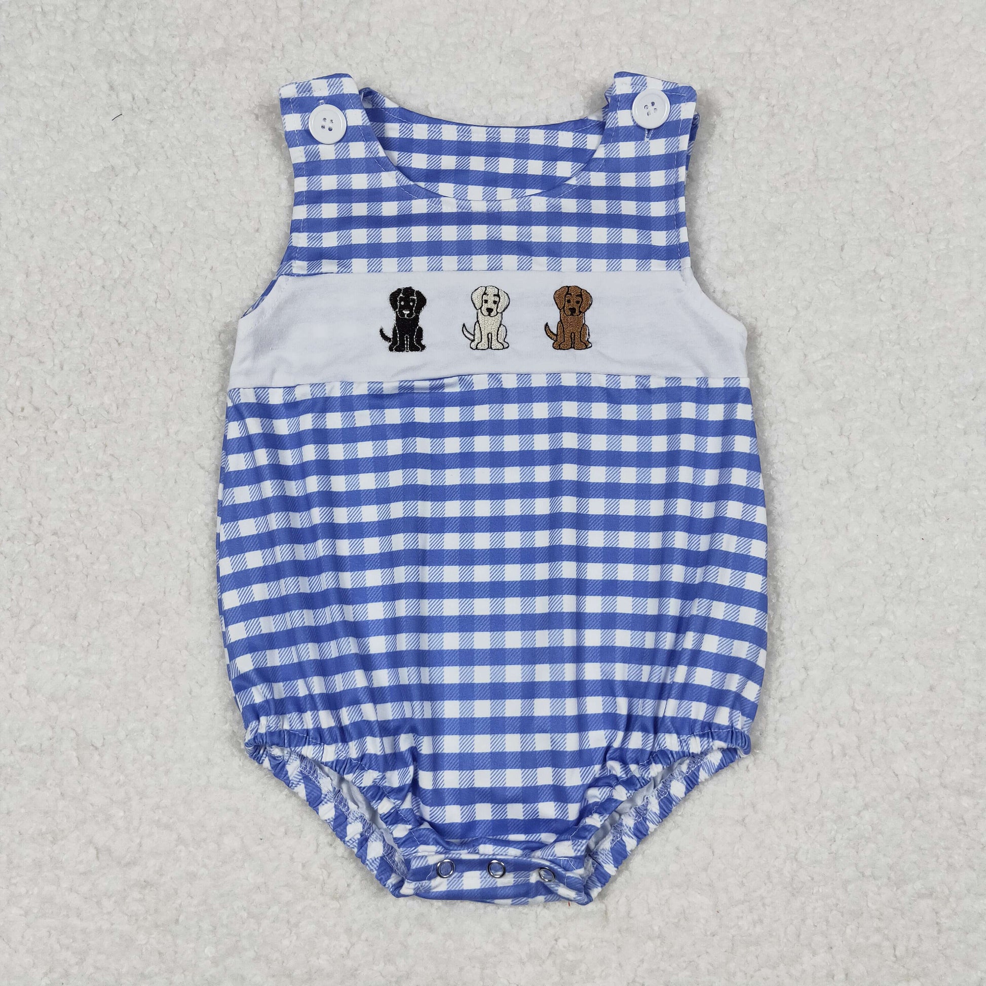 SR1048 Embroidered Puppy Blue Plaid Sleeveless Boys Bubble Romper RTS 202508