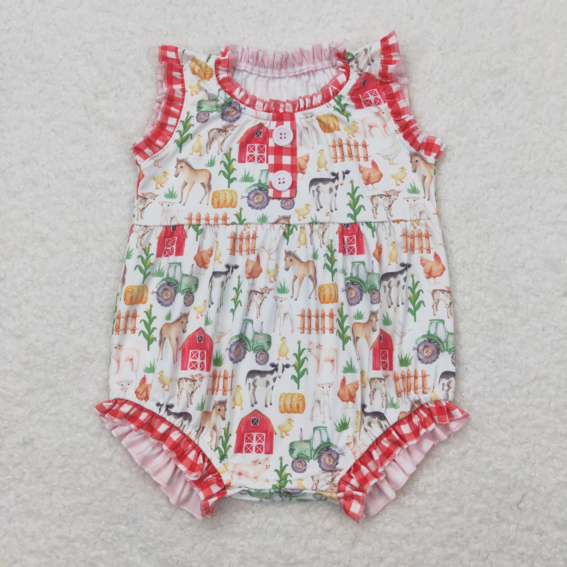 SR1294 Farm Animals Pattern Red Plaid Ruffle Sleeveless Girls Bubble Romper RTS 202508