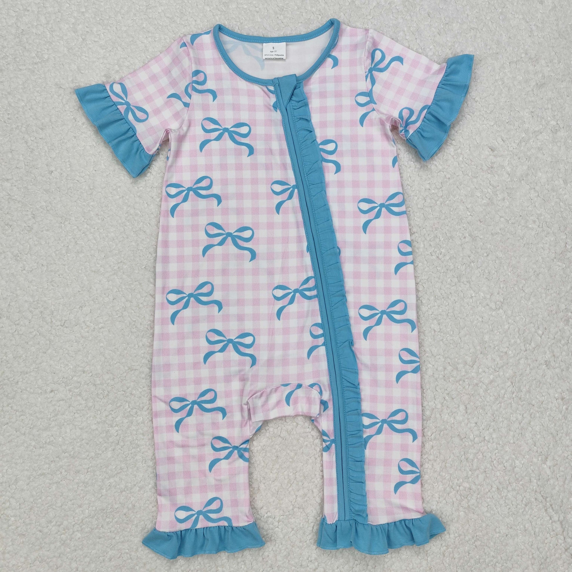 SR2026 Baby Romper blue ruffle bow pink check Romper short sleeve valentines baby girl Romper Outfits RTS 202412