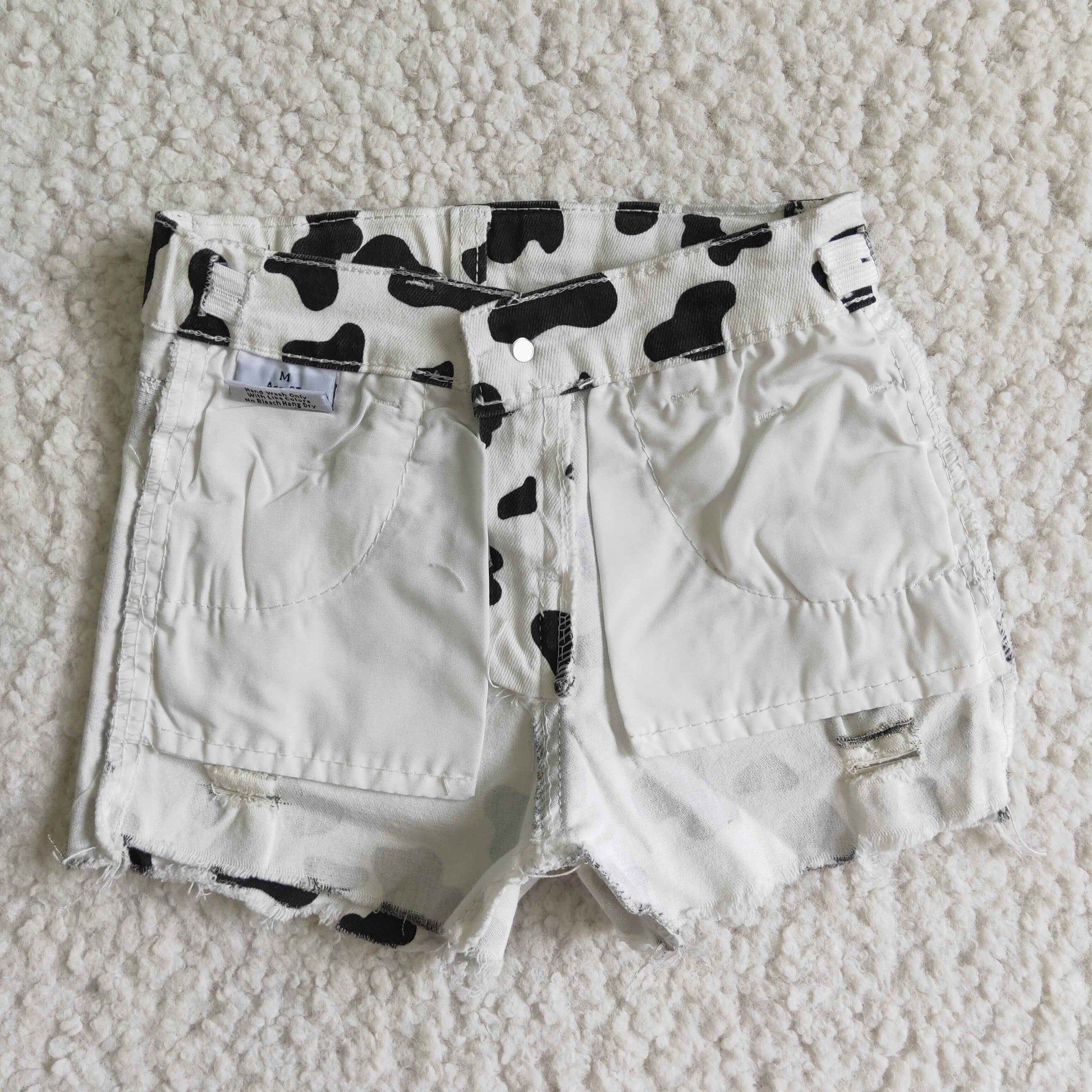 SS0027 Black White Cow Print Distress Girls Shorts Denim Jeans
