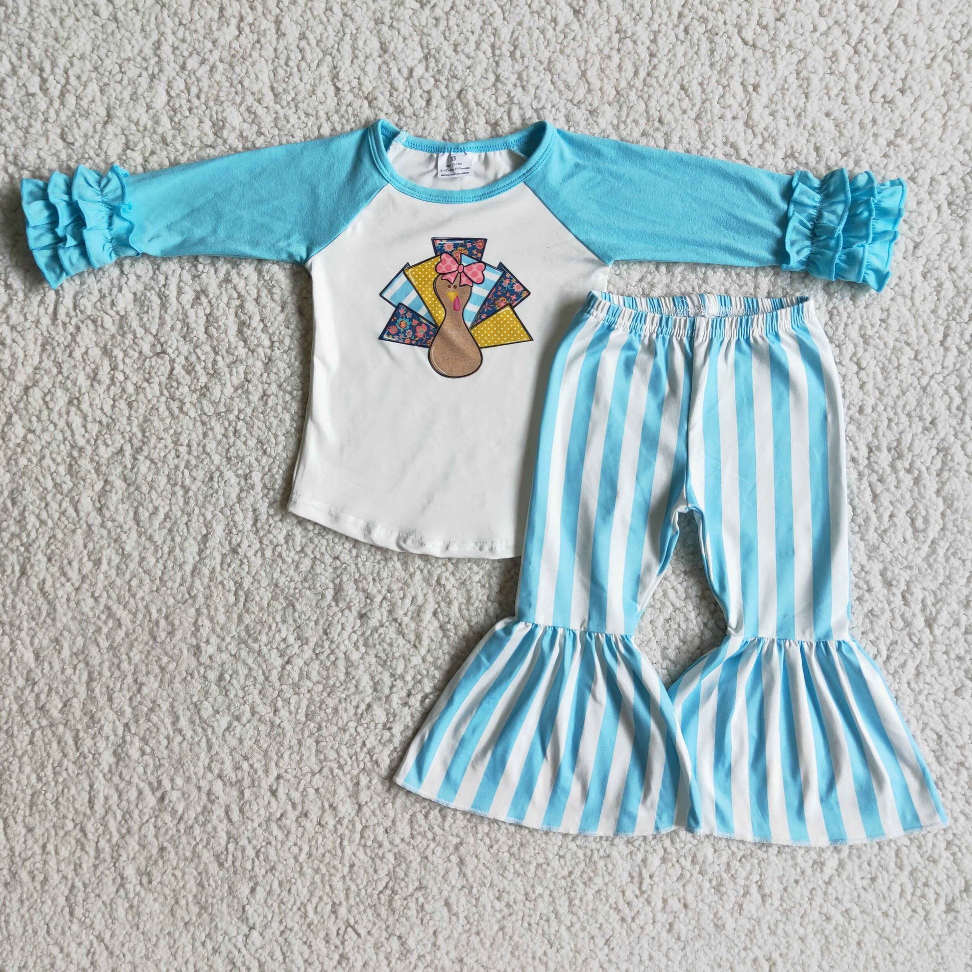 Promotion RTS 6 A4-16Thanksgiving Blue Ruffles Sleeve Turkey Striped Print Kids Outfits
